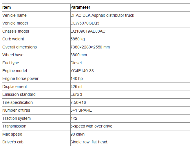 Specifications of Dongfeng DLK 4x2 6m3 Asphalt Distributor Truck: