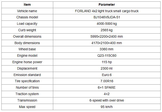 Specifications of FORLAND H2 4x2 3-5T Light Cargo Truck: