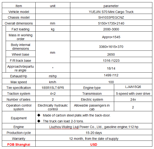 Specifications of YUEJIN S70 4x2 2T Mini Cargo Truck: